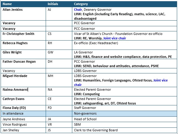 The Governing Board at St Alban’s C.E Primary re-constituted in September 2015 in line with statutory guidelines.