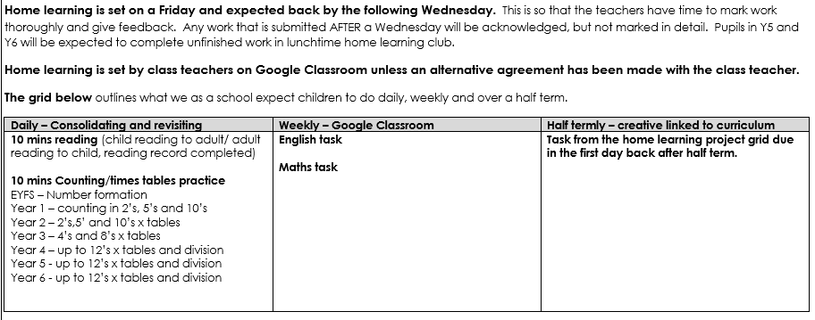 We consider home learning to be a valuable element of the learning and teaching process.  It provides children with the opportunity to practise skills taught in class, develop independent learning skills and begin to recognise that learning takes place beyond the classroom.